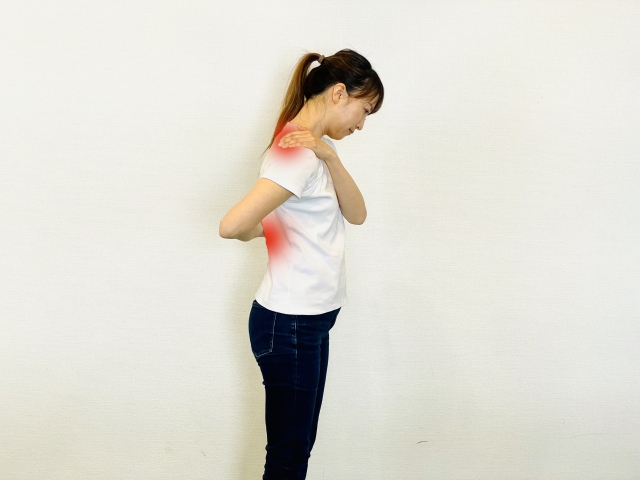 背中の筋肉が弱く、姿勢を支える力が不足していると、他の筋肉が代償的に働いて過緊張を起こします。